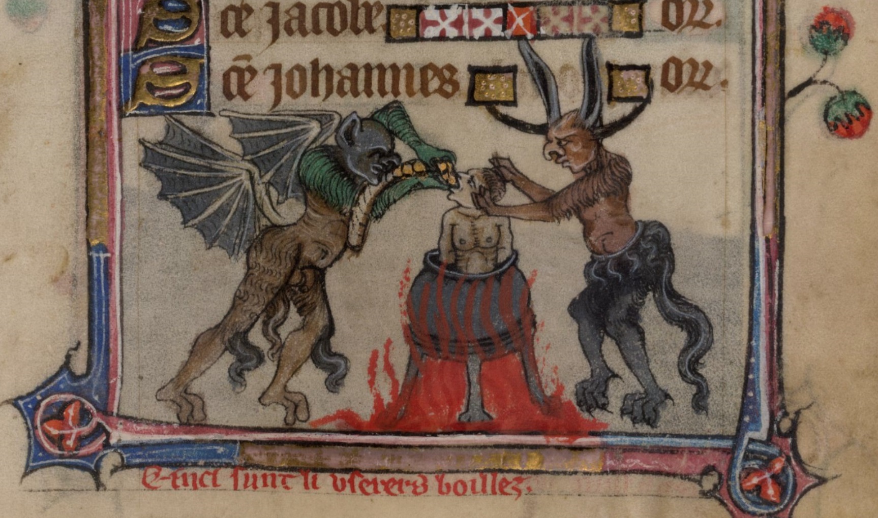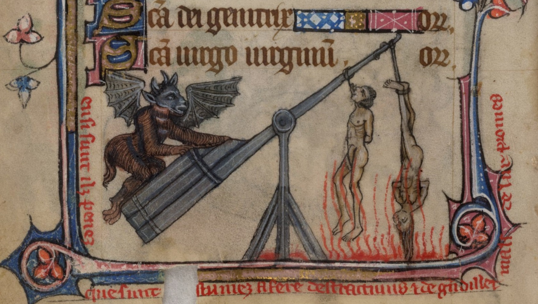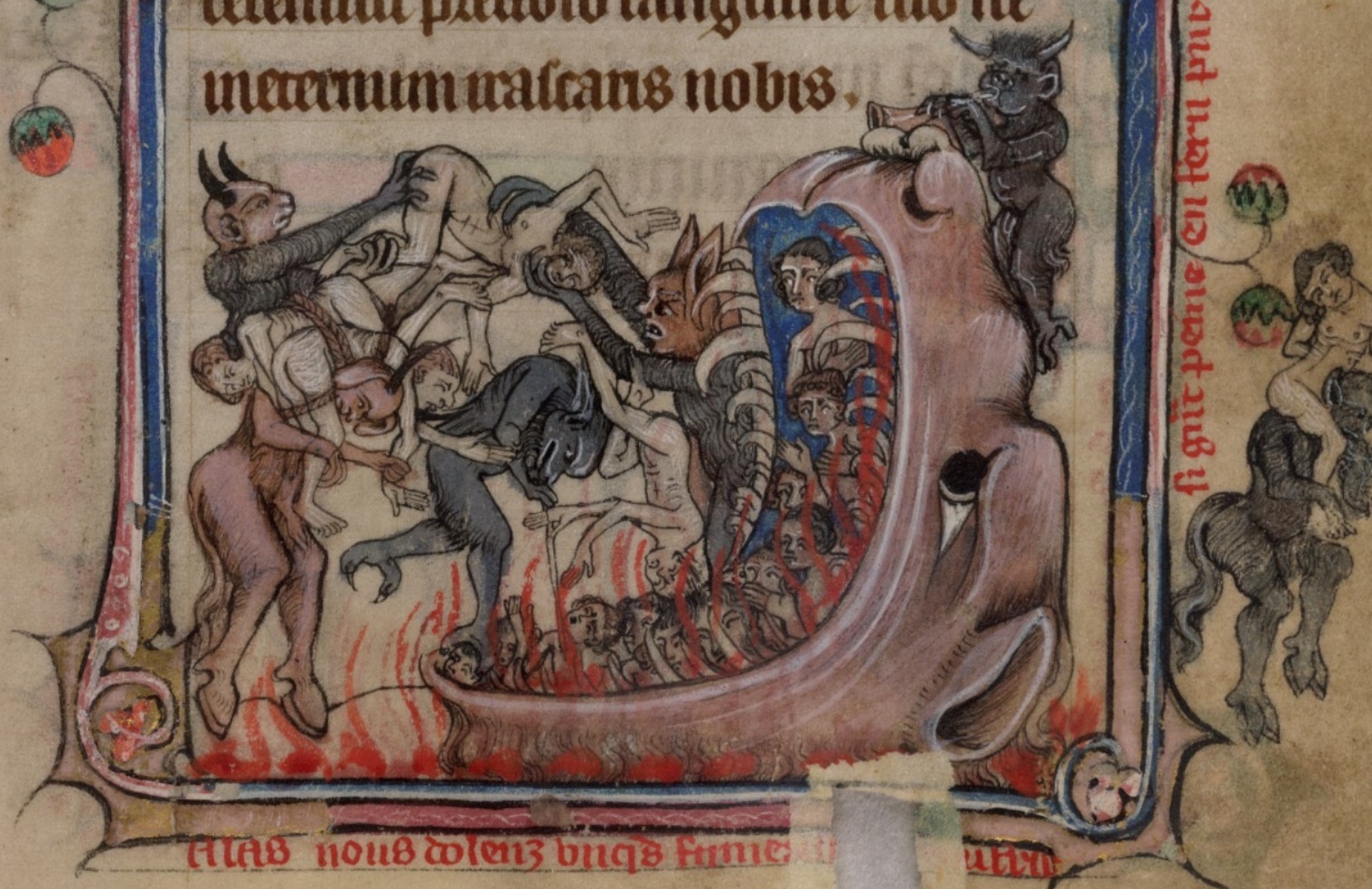 O Taymouth Hours é um livro de horas datado de 1325-40. Retenho algumas iluminuras alusivas às atividades dos demónios . Não existissem autênticas bandas desenhadas no século IX, nomeadamente com episódios da Bíblia, diria que o Taymouth Hours antecipa o género. Dedicados e despachados, os demónios carregam os condenados para a boca do inferno. No interior, o ambiente é febril. As tarefas nunca acabam. Acumulam-se. Uma vez terminados, os suplícios têm que ser recomeçados. A never ending pain!
