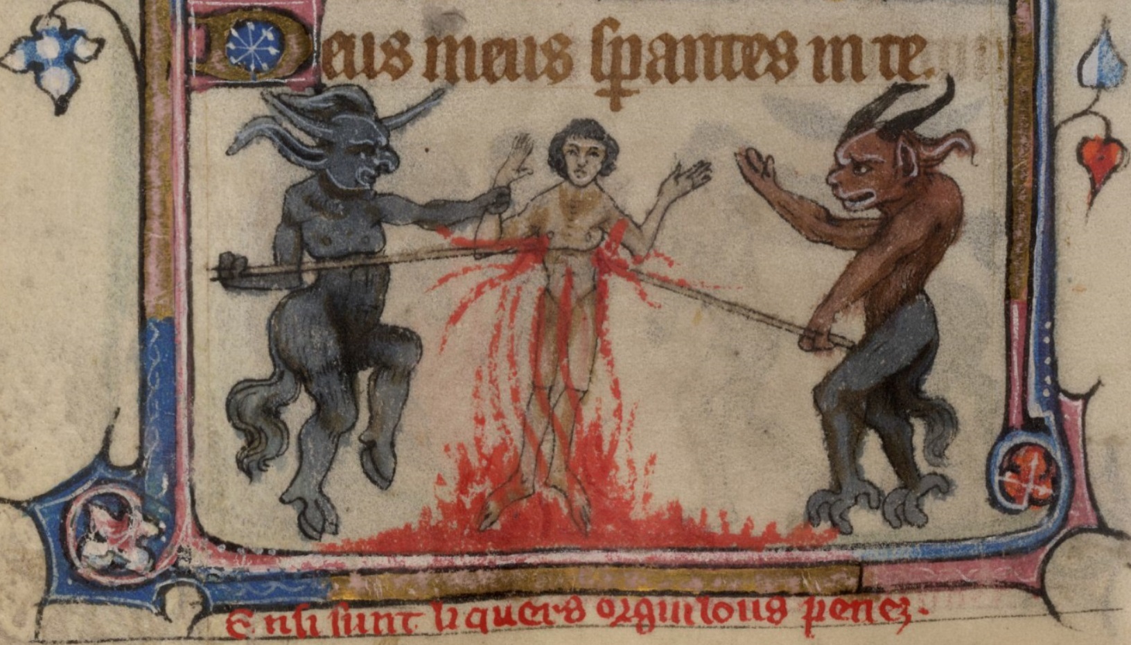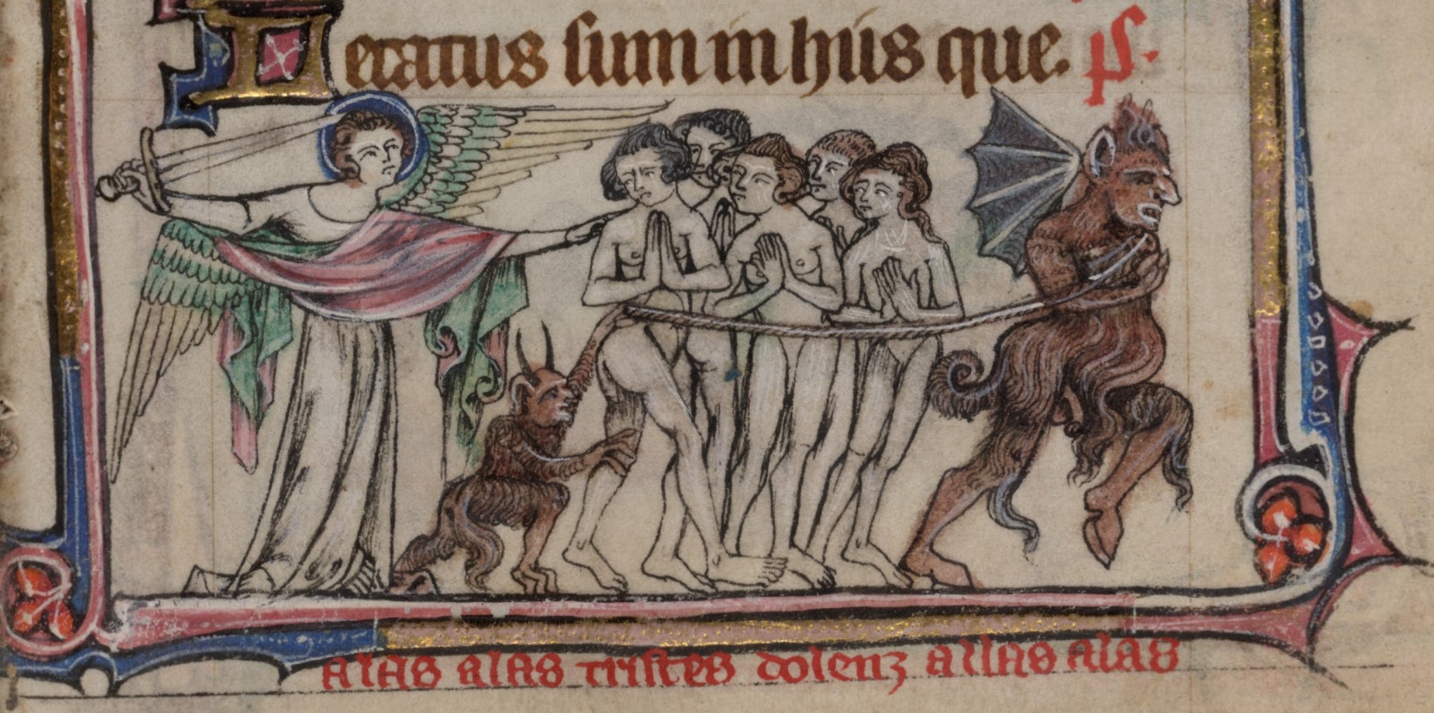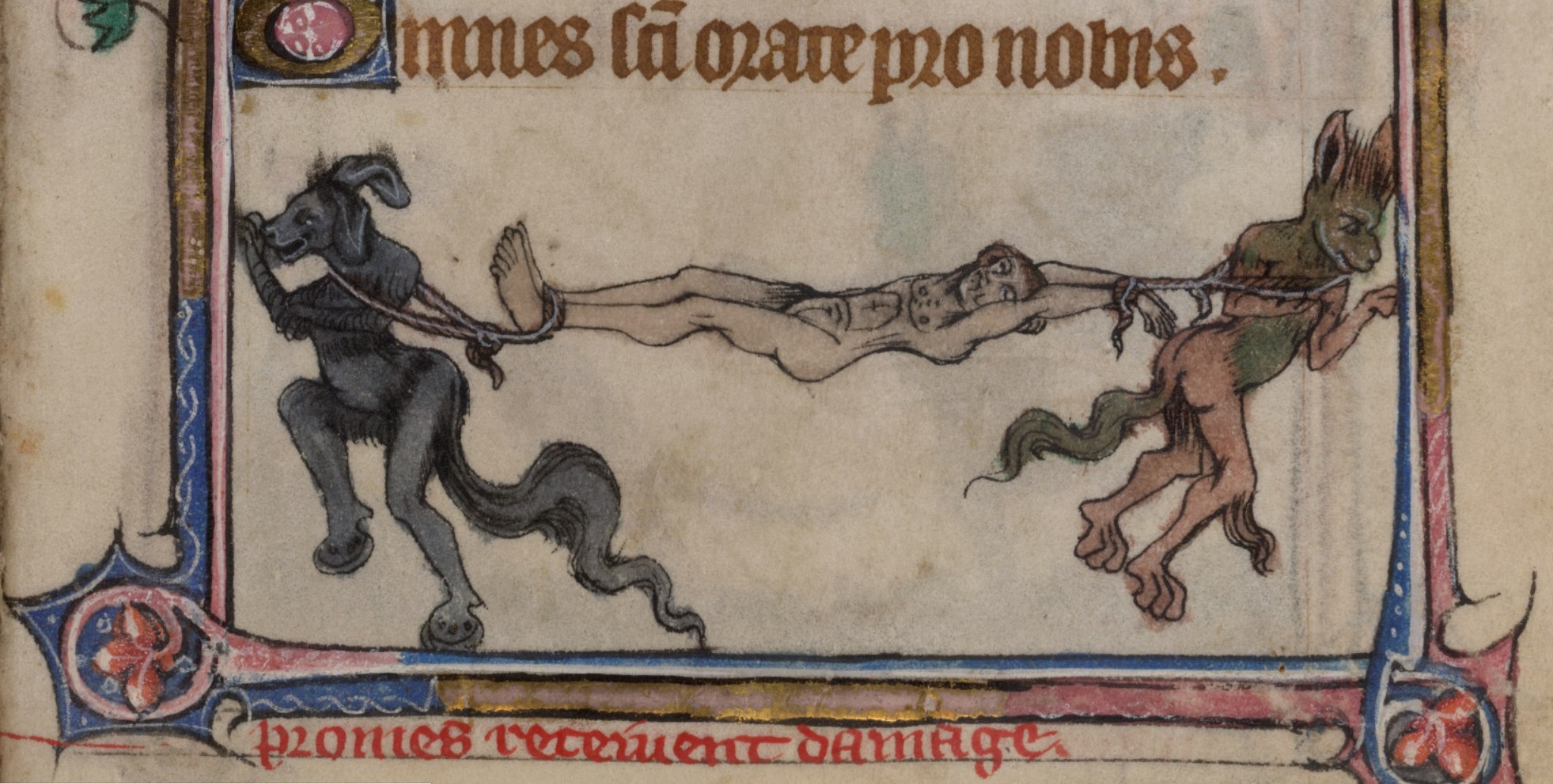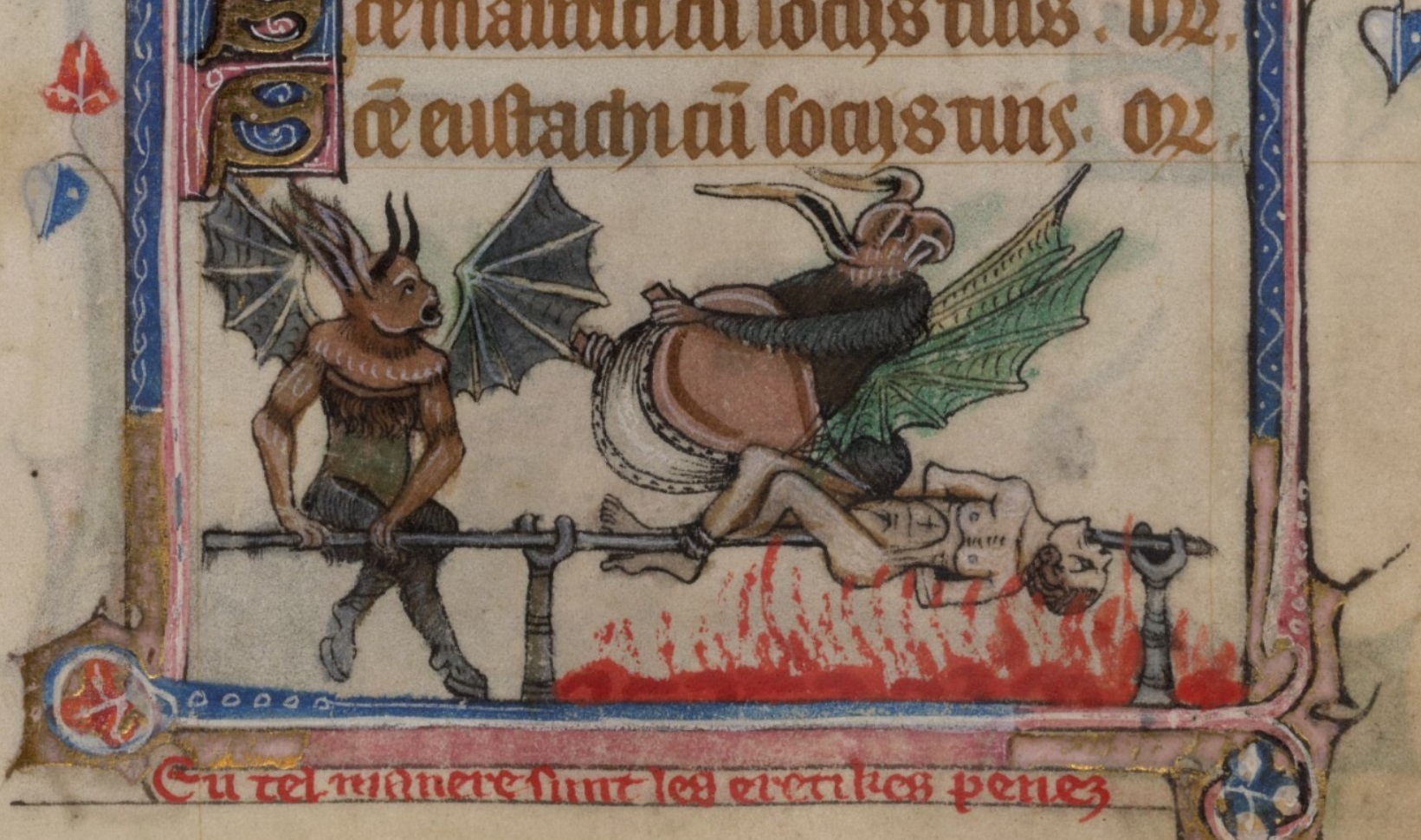 O Taymouth Hours é um livro de horas datado de 1325-40. Retenho algumas iluminuras alusivas às atividades dos demónios . Não existissem autênticas bandas desenhadas no século IX, nomeadamente com episódios da Bíblia, diria que o Taymouth Hours antecipa o género. Dedicados e despachados, os demónios carregam os condenados para a boca do inferno. No interior, o ambiente é febril. As tarefas nunca acabam. Acumulam-se. Uma vez terminados, os suplícios têm que ser recomeçados. A never ending pain!