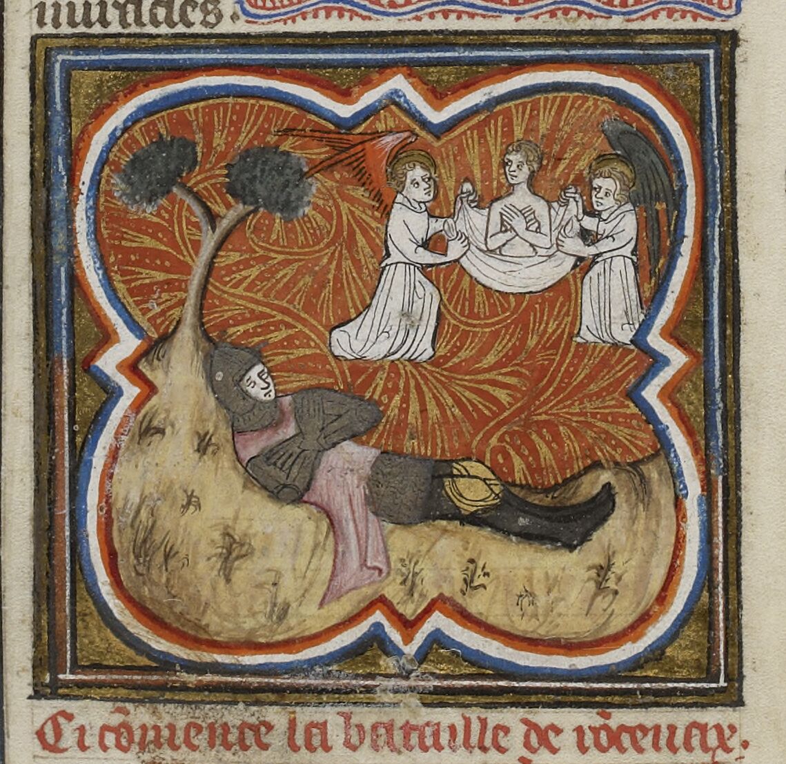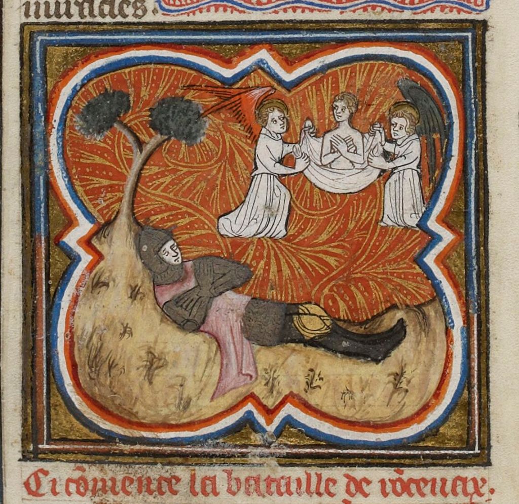 As almas são representadas sob a forma de crianças ou, em alguns casos, como miniaturas do morto. Há almas benditas, conduzidas por anjos, num tecido branco, para o céu. Nestes casos, o morto, lendário ou real, pode manter-se apostrofado, identificado, ser alguém até no outro mundo. Na figura 7, o morto é Rolando, pretenso sobrinho do Imperador Carlos Magno, herói do romance La Chanson de Roland. Numa versão do século XII (Pseudo-Turpin), o arcebispo Turpin tem uma visão: o rei Marsiliun é transportado por demónios e a alma de Rolando por anjos (Merwin, W. S., 2001, Song of Roland, New York / Toronto, Modern Library Paperback Edition, p. XIV).