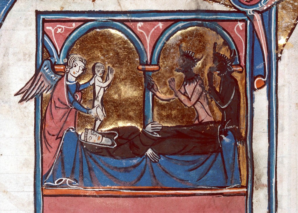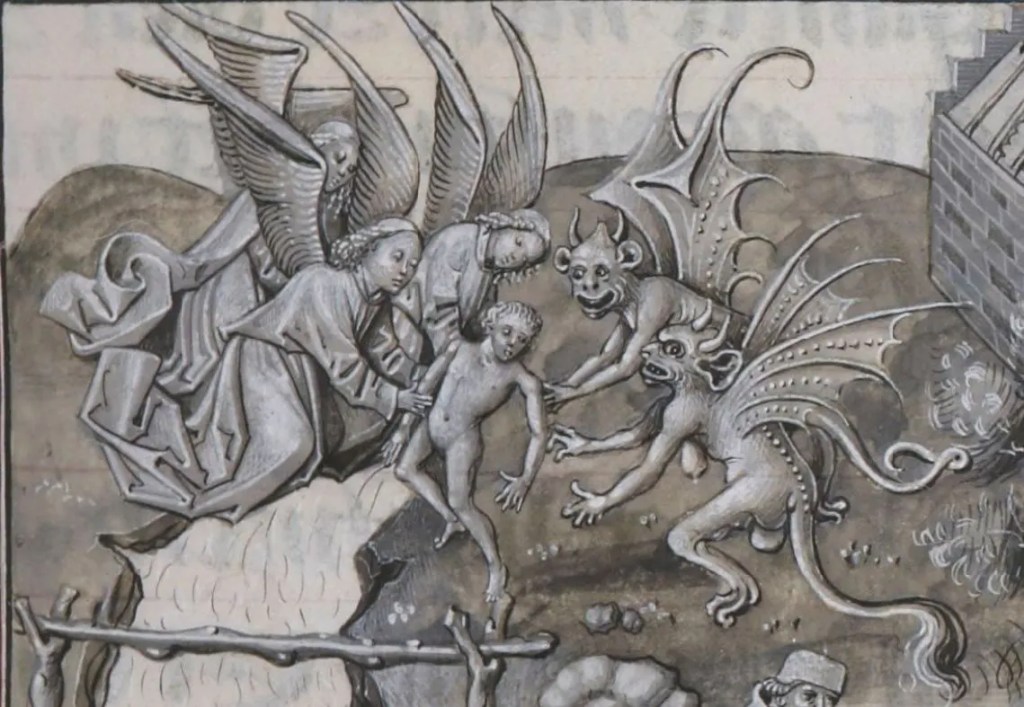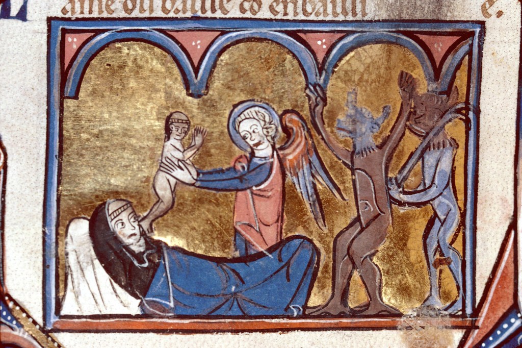 Muitas almas não têm salvação. Condenadas, sem indulgência, são esperadas pelos demónios que as transportam para a boca do inferno (figuras 2 a 3). Há, porém, almas cuja salvação ainda não está decidida. São motivo de disputa entre anjos e demónios (figuras 4 a 6). Um reparo: se os anjos e os demónios lutam pelas almas dos moribundos, então a salvação não depende exclusivamente do comportamento neste mundo, da vida terrena, nem está adiada para o Juízo Final. Há margem para resgate durante a passagem, eventualidade que inspira as ars moriendi, livros que ensinam a enfrentar a morte, ou purificação no outro mundo, neste caso são almas polémicas, talhadas para o recém-inventado purgatório, o terceiro lugar do além (Goff, Jacques Le, 1981, La Naissance du Purgatoire, Paris, Gallimard).