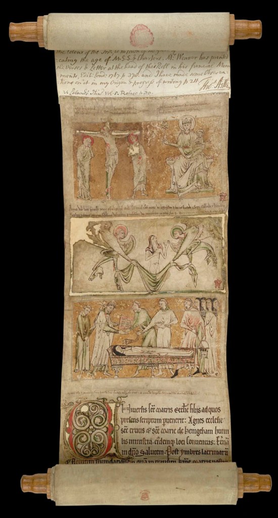 No rolo mortuário da figura 8, a pessoa morta é Lucy, fundadora e primeira prioresa do convento beneditino de Castle Hedingham, em Essex. Na imagem central, Lucy é elevada por dois anjos. Na parte superior, aparecem Cristo e Nossa Senhora com o Menino. O rolo mortuário, mandado fazer pela sucessora, foi enviado a 122 entidades religiosas. A intenção e a mensagem são inequívocas. Há poucos santos na terra, mas, provavelmente, também não abundam no Céu.