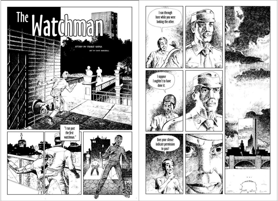 “I ran past the first watchman. Then I was horrified, ran back again and said to the watchman: ‘I ran through here while you were looking the other way.’ The watchman gazed ahead of him and said nothing. ‘I suppose I really oughtn’t to have done it,’ I said. The watchman still said nothing. ‘Does your silence indicate permission to pass?'”(5).